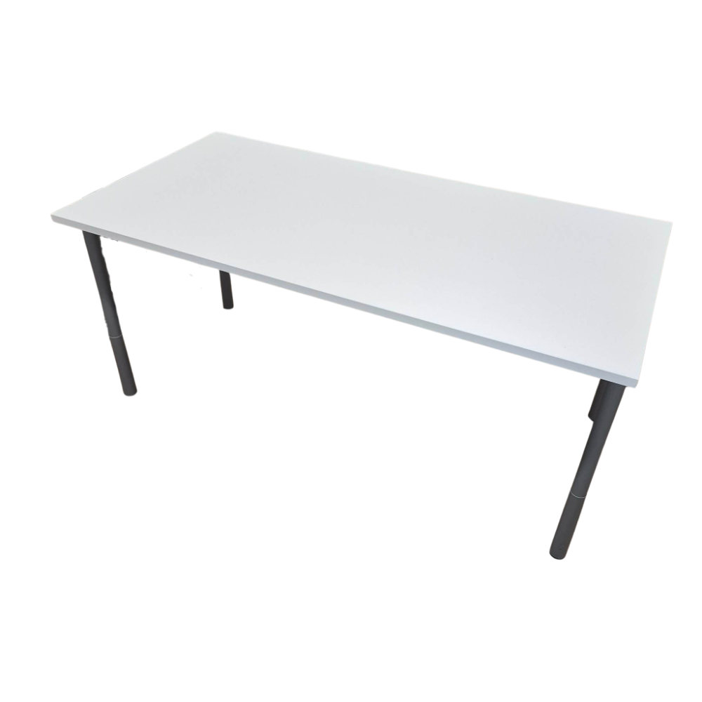 Jämäkkä työpöytä korkeussäädettävillä tolppajaloilla. Kansilevy uusittu.